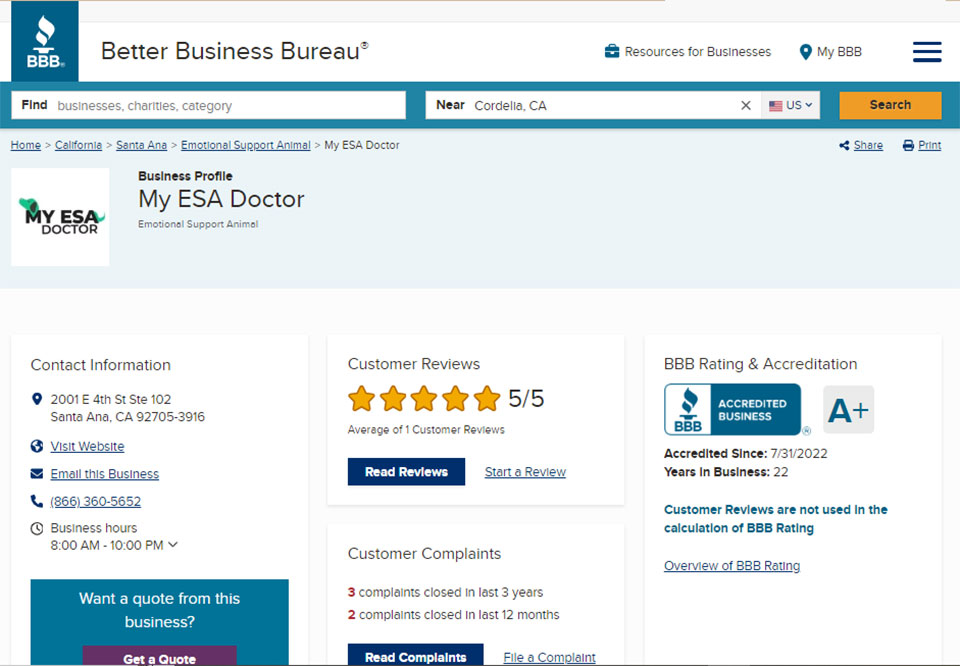 We are a BBB accredited business, and always ensure that clients get exceptional, fast ESA registration services.
