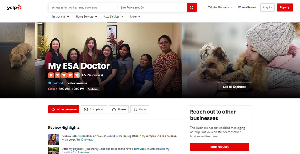My ESA Doctor has positive reviews on Yelp and has a 4.5/5 rating.